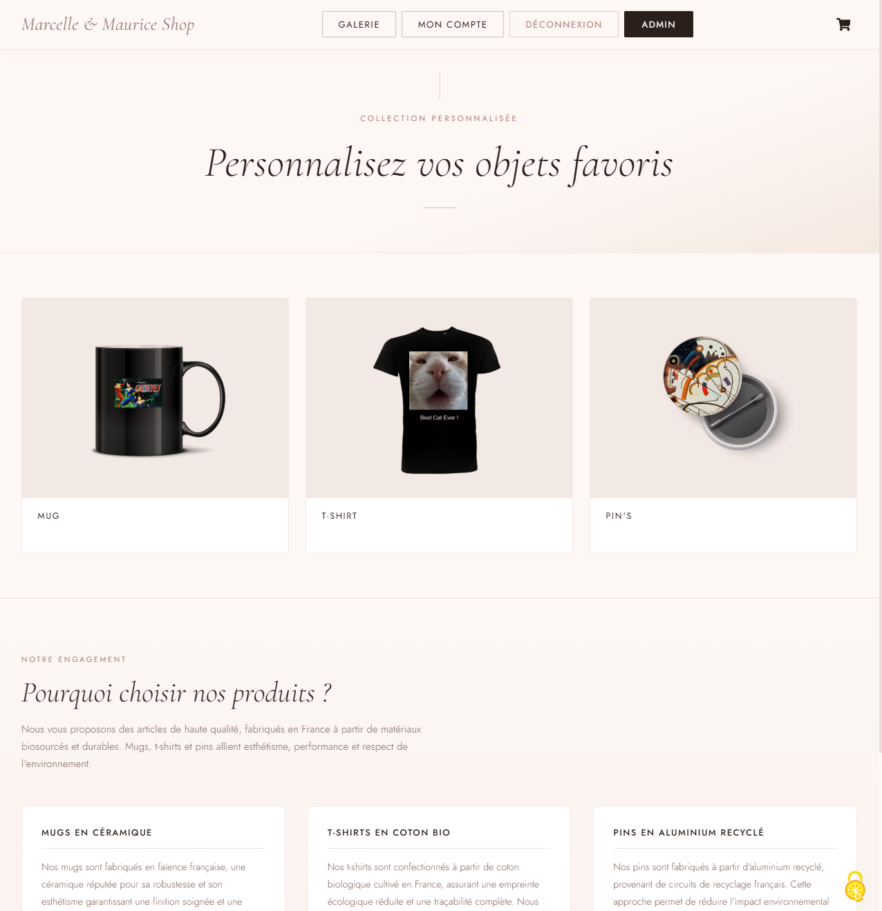 Site e-commerce de personnalisation et vente d'objets (mugs, t-shirts, pins) avec interface de customisation en temps réel, galerie d'images, panier et paiement Stripe.