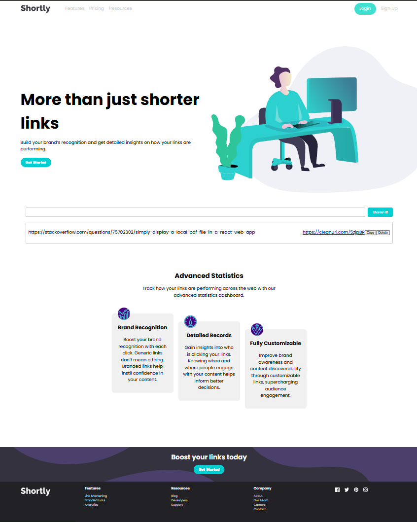 Challenge Front End Mentor réalisé en une demi-journée. Intégration de l'API Clean URI pour créer des URL raccourcies et les afficher selon les maquettes.